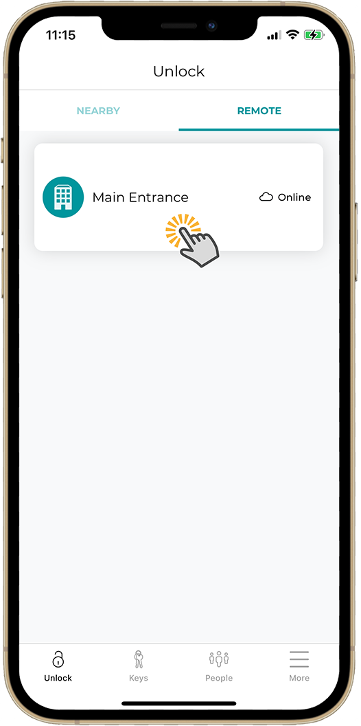 To remotely unlock your door, go back to the KEYS tab, tap remote at the top, and tap on your key to unlock the door. Please note: The Nexkey controller will still show as “Offline” for a couple minutes while it’s communicating with our server. You can speed this process up by swiping down on the KEYS tab to refresh its status.